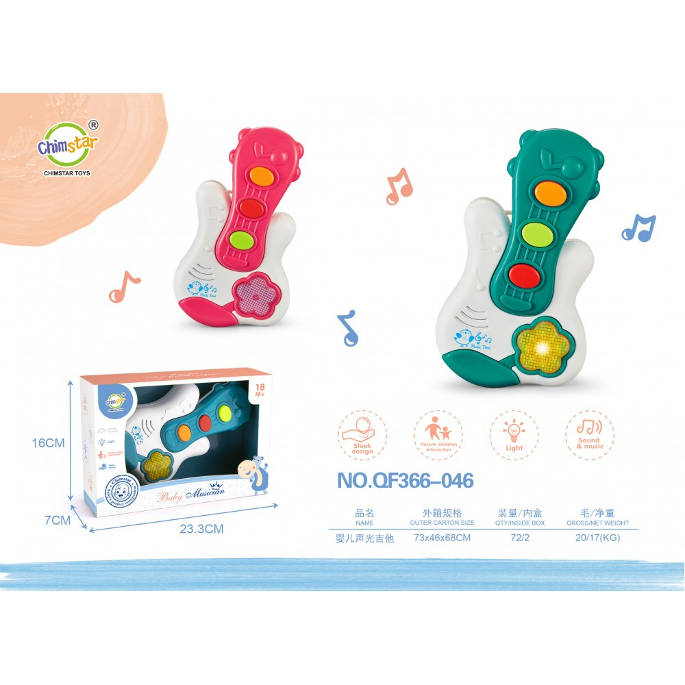 Βρεφικό παιχνίδι μίνι κιθάρα με μουσική, ήχους και φωτισμό, ιδανικό για μωρά και νήπια που ανακαλύπτουν τον κόσμο της μουσικής μέσα από το παιχνίδι. Διαθέτει χαρούμενες μελωδίες, διασκεδαστικούς ήχους και φωτεινά εφέ που τραβούν την προσοχή του παιδιού και ενισχύουν την αισθητηριακή του ανάπτυξη.
